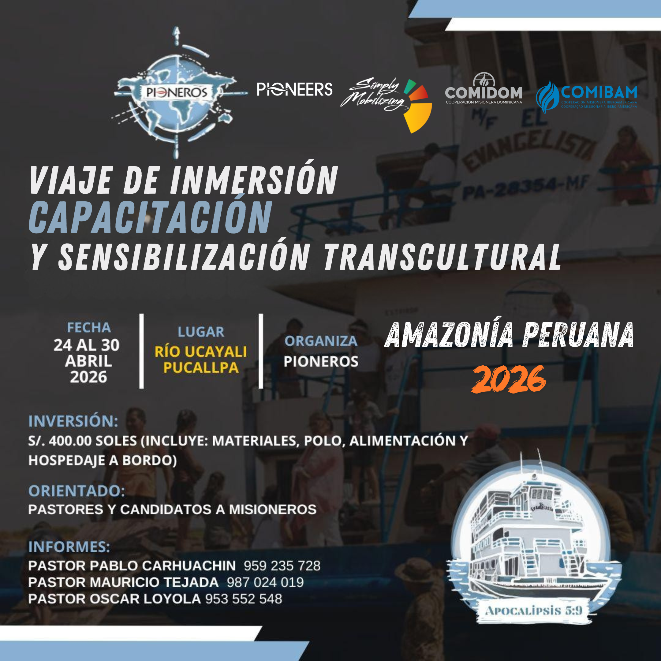 Buscando un despertar misionero a nivel nacional e internacional. Pioneros Perú organiza viajes de inmersión invitando a líderes de diferentes iglesias, pastores, candidatos a misioneros, a sumergirse en un entrenamiento teórico y vivencial en el barco El Evangelista mientras navega por el Río Ucayali, recibiendo capacitación de siervos y siervas del Señor con años de experiencia en el trabajo misionero intercultural. Dios a usado estos viajes para sembrar una visión y amor por los pueblos amazónicos, unidad entre las iglesias en amor y respeto en el servicio del Señor.